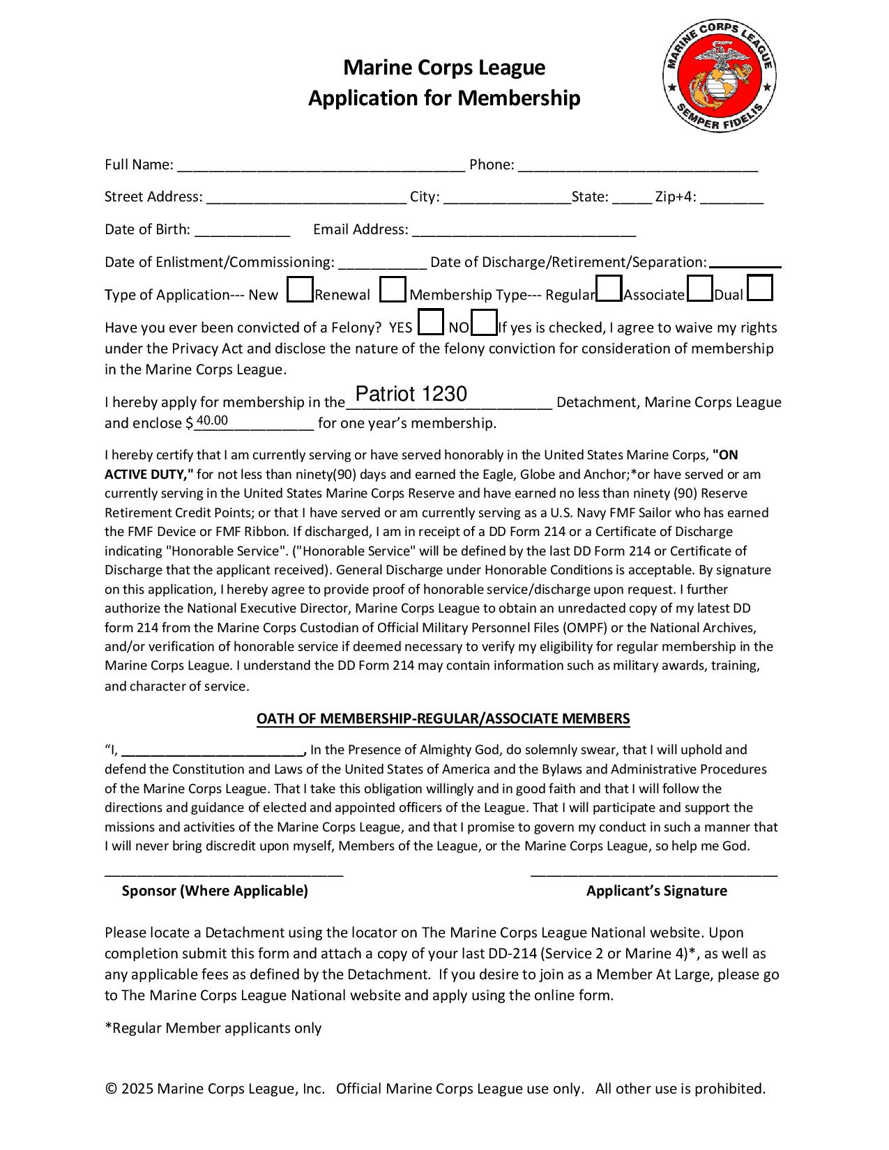 We would love to have Marines as members of our Detachment. Please click the following link for information about our Patriot Detachment as well as an application for membership.